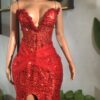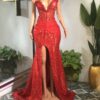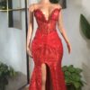 Make a grand entrance in this stunning prom dress designed to turn heads.A luxurious floor length red dress with high slit crafted from high-quality pimple lace for a sleek, smooth finish flattering silhouette hugs your curves in all the right places.Delicate embellishments add a touch of sparkle and glamour ,flowing dress moves gracefully with every step you take.Perfect for prom,evening,wedding,homecoming events, or any special occasion.